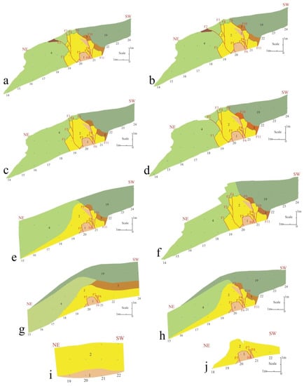 The back-stripping scenario on the eastern wall of the trench (TC). The scenario confirms the seismic deformation of the events Ev5 to Ev9 by Doroud Fault activity. The red lines are faults. (a) Pre-event 5. (b) Post-event 5 with faulting and fault scarp formation. (c) Pre-event 6. (d) Post-event 6 cutting unit C1 (colluviums wedge). (e) Pre-event 7. (f) Post-event 6 associated with cutting unit 4. (g) Pre-event 8. (h) Post-event 8 associated with cutting unit 3. (i) Pre-event 9. (j) Post-event 9 associated with cutting unit 2. Read the text for details.