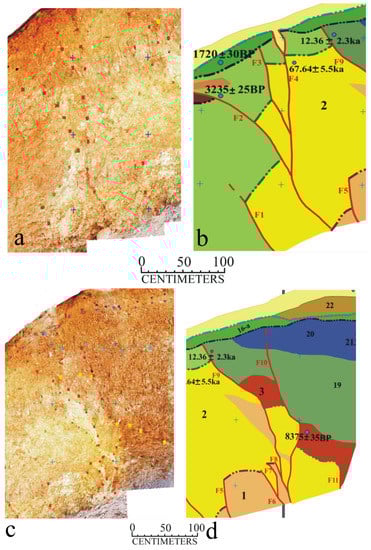 The evidence for the Ev6 event (a,b) and the Ev8 and Ev9 events from the fault zone B (c,d). (a,b) Close-ups showing photomosaic and interpretative sketch of the fault F1 and F3 strands near meters 19 and offsetting units 4, as well as the event horizon (dashed line green), which abruptly terminates upward at the base of the most recent undisturbed deposits (units 16-a and 4). (c,d) Close-ups showing photomosaic and interpretative sketch faults F5, F6, F7, F8, F9, F10, and F11 strands near meters 20 and 21 and offsetting units 3 and 2, as well as the event horizons (dashed lines red and gray for base units 3 and 2) which abruptly terminate upward at the base of the most recent undisturbed deposits (units 3 and 2).