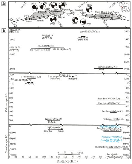 (a) Meizoseismal areas of medium to large earthquakes along the Zagros Main Recent Fault. (b) Time–space diagram of the earthquakes along the Zagros Main Recent Fault. The 1957 and 1958 focal mechanisms are after []; the 1963 solution is after [] with waveform modeling, which represents a centroid depth from 8 km; 1987 is the CMT solution from Harvard; the 2006 earthquake with a centroid depth of 6 km is from []. The early fault plane solutions were based on the in-print short-period polarities, and it is not probable to evaluate the consistency of these early solutions. The figure is modified after [].