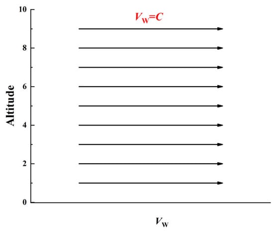 In Equation (1), VW is the wind speed at height h, which is selected as Mach number 0.3, Mach number Ma = VW/a, and a is sound speed. The Mach number corresponding to C in this paper is 0.3. As shown in Figure 2, the velocity has no gradient along the height direction and wind speed is constant.