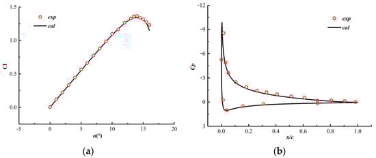 In order to verify the numerical method, numerical simulation of the NACA0012 airfoil is performed at a freestream condition with Mach number Ma = 0.3 and Reynolds number Re = 4.0 × 106. It should be noted that grid independence has been verified. The grid mesh size and distribution are carefully adjusted to ensure the numerical results are no longer changed due to the change of the grid. Because NACA0012 is a very common benchmark which has been discussed in many studies, grid independence will not be discussed in this paper. As a result, the numerical calculation results are consistent with the experimental results as shown in Figure 5. Compared with experimental results [26], the results show that the lift curve and airfoil surface pressure are in good agreement with experimental results in the literature. Therefore, the numerical simulation method and calculation grid of this paper meet the calculation requirements, the results of subsequent numerical calculations in this paper are credible and the conclusions obtained are reliable.