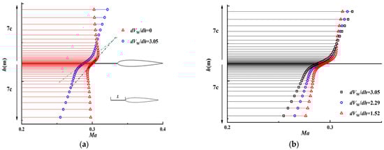 Velocity distribution near the chord axis in Linear distributed shear wind (L = c, α = 7°): (a) At a positive gradient and no gradient state; (b) At a different positive gradient state.