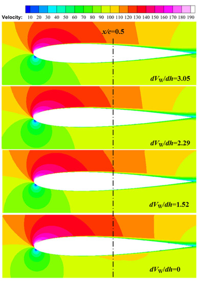 The velocity profile before the airfoil was under different gradients is illustrated in Figure 6b. As the airflow passes the airfoil, the rearranged velocity distributions are depicted in Figure 7. It is shown that the velocity magnitude near the chord axis decreases from 125 m/s to 118 m/s as the velocity gradient increase from 0 to 3.05. On the other hand, air velocity behind the lower airfoil surface remains almost the same in the four cases. It can be estimated that lift has decreased as the velocity gradient increased from 0 to 3.05.