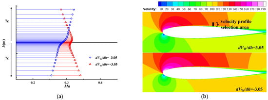 Velocity distribution of linear distributed shear wind field: (a) Velocity distribution near chord axis (L = c, α = 7°); (b) Velocity magnitude contour near the airfoil surface (α = 7°).