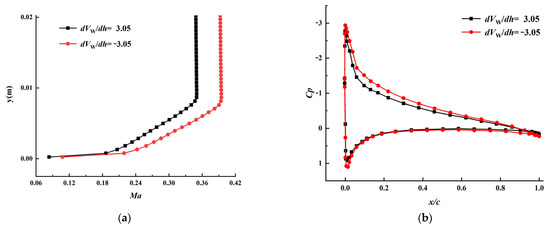 Figure 13a shows that the maximum lift-drag ratio of an airfoil, as well as the corresponding angle of attack, increases significantly when the velocity gradient is increased. When the gradient is reduced to dVW/dh = 1.52, the maximum lift-drag ratio is decreased by 28.8% for the dVW/dh = 3.05 condition. Considering decreases in lift and increases in lift-drag ratio at a positive gradient, it can be deduced that airfoil drag has been significantly reduced. Therefore, a positive gradient is more conducive to the cruising flight of a vehicle, which is the reason why birds can cruise long distances in shear wind fields with very little energy consumption. If aircraft could adopt air energy in shear winds, they will achieve long-distance flight with very low energy consumption.
