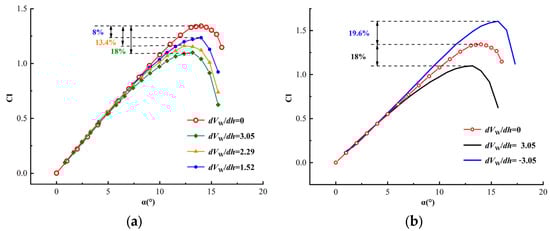 The lift curve of a negative gradient case is shown in Figure 11b. It is shown that a negative gradient increases lift which is consistent with the conclusion discussed in the previous Section 3.2. Compared to a positive gradient, a negative gradient also increases the slope of the lift curve, maximum lift coefficient and stall angle of attack. Compared to a gradient-free wind, the maximum lift coefficient of the negative gradient is increased by 19.6% and the stall angle of attack is increased to 16°. Therefore, a negative gradient increases lift and delays stall at the same average speed, which is the reason why birds use shear wind to keep rising to gain potential energy and finally achieve long-distance gliding flight. Therefore, only a small angle of attack is needed to generate sufficient lift required for the ascent in a negative gradient wind, which is of great value for the take-off and landing of UAVs.