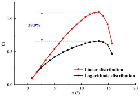 Lift curves of the airfoil under a linear and logarithmic distribution of shear winds.