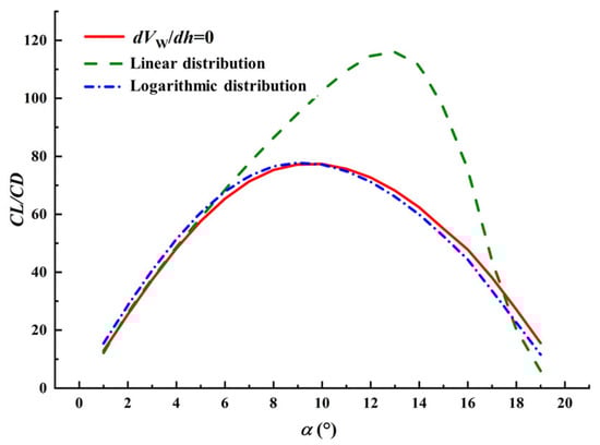Lift-drag ratio of airfoil with different velocity distribution of shear wind.