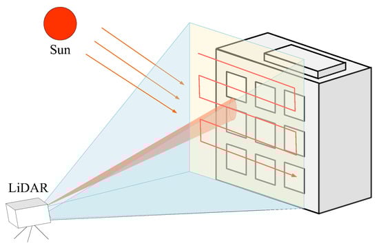 Noise in the LiDAR system is caused by the superposition of various noises, which can be divided into internal device noise and external noise according to the source of noise []. Background noise at the receiving end includes signals irradiated or reflected onto the detector from undesired radiation sources such as the sun and artificial light sources []. In daytime photoelectric detection, external background noise is usually far greater than the noise of the internal device of the system, the radiation source is mainly the sun, and the energy is concentrated in the visible and infrared spectrum []. According to ASTMG173 solar spectral data, within the spectral response range of LiDAR, the corresponding irradiance of direct sunlight is high []. Therefore, when LiDAR scanning works under strong sunlight, its instantaneous receiving field of view changes rapidly, and the background noise in different fields of view varies greatly.