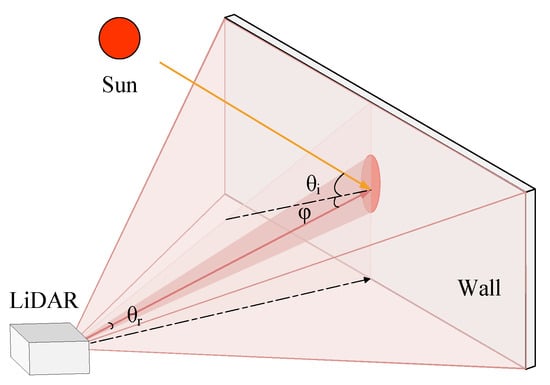 As shown in Figure 1, sunlight enters the receiving end through target reflection and atmospheric scattering, and the background light power affects the detection of weak signals by LiDAR. Under uniform atmospheric conditions, the irradiance Eλ of sunlight on the ground can be obtained by integrating the spectrum of sunlight near the ground. Letting the sunlight be a beam of parallel light, the angle between the light and the target surface normal is θi, the atmospheric one-way transmission is Tr, the target reflection coefficient is ρ, the receiving field angle is θr and the angle between the receiving optical axis and the target surface normal is ϕ. Then, the background radiation power received by the detector is as follows []: