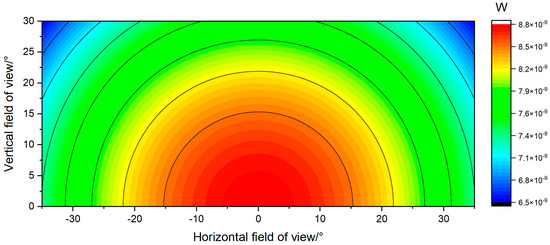 As shown in Figure 2, a simple building wall is used as an example to simulate Equation (1) to understand the variation in the background noise at each angle at the receiving end in the detection field of view. We can assume that the sunlight is incident on the wall of a building perpendicular to the ground normally at an angle of 60°, and the LiDAR is parallel to the opposite side. The horizontal field of view detected by the laser radar is ±35°, the vertical field of view is 30°, the optical transmittance is 0.8, the receiving field of view angle is 2 mrad, the receiving optical aperture is 50 mm and the filter bandwidth is 20 nm. The one-way transmittance of the atmosphere is 0.99, the reflection coefficient of the wall is 0.5 and the radiant illuminance of the sunlight on the ground is 1000 W/m2/μm. The simulated background noise variation of the building wall in the scanning field of view is shown in Figure 3.