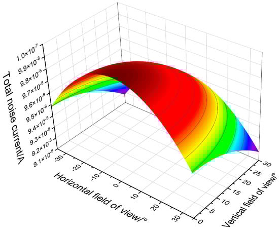 where e denotes the elementary charge, B is the noise bandwidth, M is the APD multiplication factor, F is the APD excess noise factor, Ro is the APD unit multiplication factor response rate, Ps is the received signal power, idb is the multiplied (bulk) of the dark current, ids is the un-multiplied (surface) of the dark current, K is the Boltzmann constant, T is the temperature and RL is the equivalent load resistance. Based on the background radiation results in Figure 3, the noise changes in the receiver are analyzed through Formula (3), as shown in Figure 4. The simulation parameters are shown in Appendix A Table A1, and the proportion of background radiation to total noise current is shown in Appendix A Figure A1.