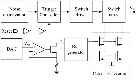 The adjustment of the signal threshold is self-adaptive through a cascaded network of current-type architecture and DAC output voltage, as shown in Figure 8. The adaptive process is divided into two steps. Firstly, the current source network is controlled to rapidly adjust the signal threshold voltage according to the quantization value of noise detection in time T1. Secondly, the noise quantization unit continues to work in time T2. The quantization result is taken as the correction value. After this detection, the DAC is controlled by the signal processing unit to adjust the reference voltage Vref of the current source network to achieve the correction of the threshold voltage VTs and VTn.