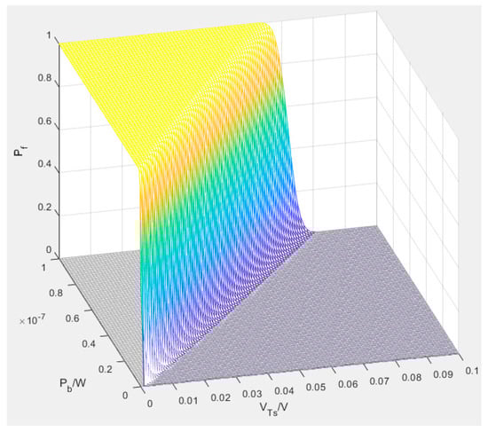 The threshold voltage is related to the designed FAR of the system. According to the parameters in Table 1, when the FAR is set at 0.1%, the simulation result is shown in Figure 9, and the optimal value of the detection threshold VTs should be taken at the intersection of the simulation result surface and the plane of the designed FAR.