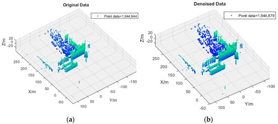 LiDAR point cloud of night (a) original data and (b) denoised data.