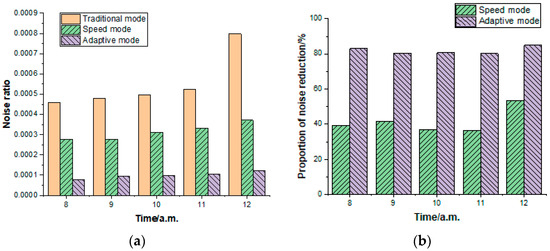 The noise of point cloud is analyzed according to Equation (20). From 8 o’clock to 12 o’clock, the comparison results of noise ratio under different methods in the experiment are shown in Figure 13b. The experimental results show that the noise ratio increases to more than 0.045% in the traditional mode, and rapidly increases to 0.08% when the background radiation is strong. The noise ratio measured in the fast mode is more than 0.028%, which is better than the traditional mode. The noise ratio of the adaptive mode is the lowest. Even at 12 a.m., the noise ratio is 0.012%, which proves that the adaptive method has a good ability to suppress background noise. Figure 13b shows the proportion of noise reduction of these two modes at different times compared with the traditional mode. It can be seen that the proportion of noise reduction of the adaptive mode is more than 80% compared with the traditional mode.
