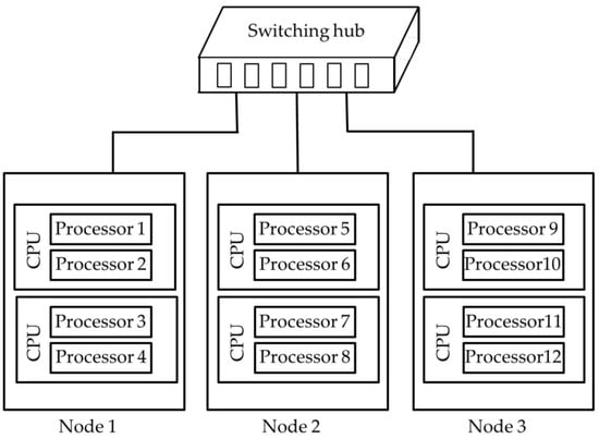 Table 6. CPU time (h) of a cluster consisting of three processors. In order to exclude the effect due to the difference in node performance, one processor was mobilized from each node. The results obtained by repeating the same simulation five times, as in the individual node evaluation, were averaged. Avg means the average value at this time, and SD means the standard deviation of the measured values.