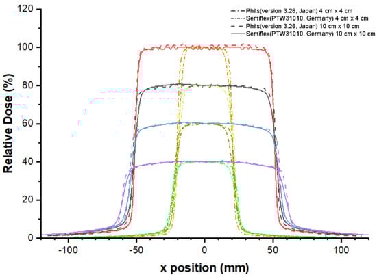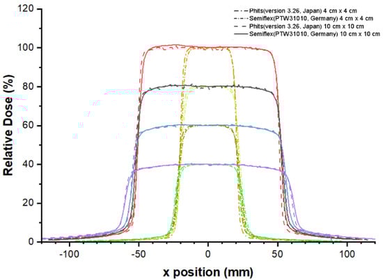 Figure 4 shows the beam profile comparison between measured data and simulated data by PHITS. The in-plane profile of both field sizes have been sorted in the order of 15 mm, 50 mm, 100 mm, and 200 mm. A constant magnification was implied for convenience to facilitate checking a lot of data at once. Magnification constant: 1, 0.8, 0.6, 0.4 for 15 mm, 50 mm, 100 mm, and 200 mm, respectively.