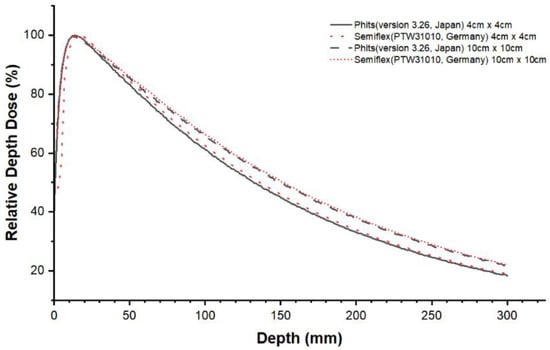 In the case of PDD data, no magnification constant has been applied. Discrepancy of the build-up region for measured data was figured out as 2 mm because each of the build-up regions was defined as 14 mm and 16 mm for measured data and simulated data (field size: 4 cm × 4 cm), respectively. An exact match was found when it comes to comparison between the cases of 10 cm × 10 cm field size. Those build-up regions were 14 mm. These discrepancies are acceptable for our purpose, giving consideration for the abovementioned criterion (Figure 6).