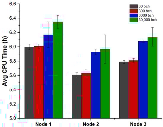 Simulation results on 30,000 bch were 6.35 ± 0.09 , 5.97 ± 0.2 , 6.14 ± 0.13 for Node 1, Node 2, Node 3, respectively. When this bch was set as “30”, required average CPU times were 6.0 ± 0.04 , 5.61 ± 0.03 , 5.79 ± 0.02. From this relationship, it seems that as bch decreases, those required times tend to decrease. Individual node performance was evaluated in the order of Node 2, Node 3, and Node 1 in all cases of bch and showed the maximum and minimum differences at 6.3% for 300 bch and 2.4% for 30,000 bch (Table 5, Figure 7).