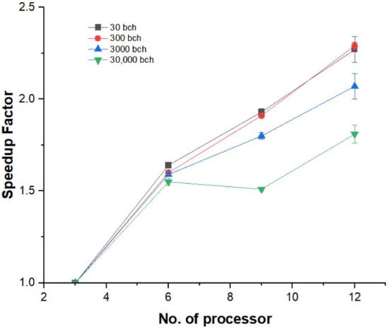 When the number of processors was increased from 3 to 6, the maximum increase was 64.0% for 30 bch. From 6 to 9 and from 9 to 12, it increased by 17.6% each. For 300 bch, there were increases of 60.0%, 19.3%, and 19.8% as the number of processors increased, and for 3000 bch, the same trend was observed. However, for 30,000 bch, it decreased by 2.5% from 6 to 9. In general, the speedup factor showed a tendency to saturate along with the increased number of processors (Table 7, Figure 8).