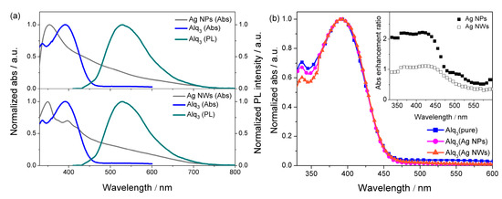 (a) Normalized absorption spectra of Ag nanostructures, and normalized absorption and PL spectra of Alq3 (pure); (b) Normalized absorption spectra of Alq3 (pure), Alq3 (Ag NPs) and Alq3 (Ag NWs); inset: the absorption enhancement ratio as a function of wavelength.