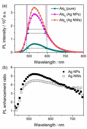 (a) PL spectra of Alq3 (pure), Alq3 (Ag NPs) and Alq3 (Ag NWs); the bi-directional arrow lines represent the FWHM of samples; (b) PL enhancement ratio as a function of wavelength.