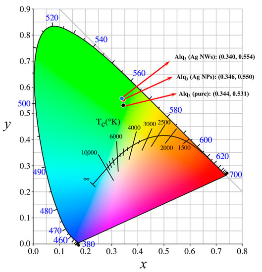 The color coordinates of Alq3 (pure), Alq3 (Ag NPs) and Alq3 (Ag NWs) in the International Commission on Illumination (CIE) are (0.344, 0.531), (0.346, 0.550) and (0.340, 0.554), respectively, as presented in Figure 4. The addition of Ag nanostructures mainly changed the y coordinates, which is indicative of a higher brightness induced by Ag nanostructures. Between the two nanostructure-embedded composites, Alq3 (Ag NWs) displays the highest brightness. Through the color coordinates, correlated color temperatures are calculated to be 5280, 5271 and 5372 K, which are suitable for the manufacture of daylight fluorescents [33].