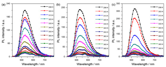 PL spectra of (a) Alq3 (pure), (b) Alq3 (Ag NPs) and (c) Alq3 (Ag NWs) under different temperatures from 298 to 393 K.