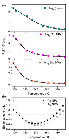 (a) Temperature-dependent IPLI of Alq3 (pure), Alq3 (Ag NPs) and Alq3 (Ag NWs); (b) IPLI enhancement ratio as a function of temperature.