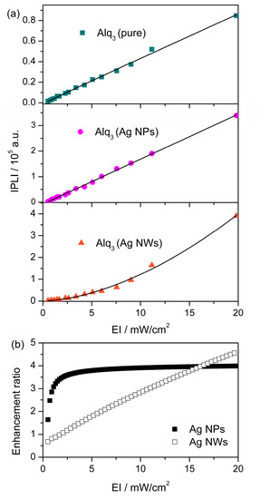 (a) EI-dependent IPLI of Alq3 (pure), Alq3 (Ag NPs) and Alq3 (Ag NWs); (b) IPLI enhancement ratio as a function of EI.