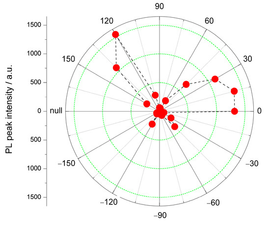 In the asymmetric Alq3–Ag NWs structure studied here, the PSPs coupling is only possible through the scattering process [40]. In order to intuitively observe the scattering feature induced by Ag NWs, the distribution of detection angle-dependent PL peak intensity is plotted in Figure 8. The normal line of samples is along the horizontal direction, and the incident light and reflected light are located below and above the normal line, respectively. As the angle between the detection direction and the normal line changes in the range of −150° to 150° in steps of 15°, the PL intensity will also change. We found that on the upper side where the reflected light is located, the PL intensity is relatively large when the detection angle is 0°–45° and 120°–135°, while on the lower side where the incident light is located, the PL is generally very weak. In particular, the PL from the detection angle of 120° is over 37.6 times stronger than that from −90°.