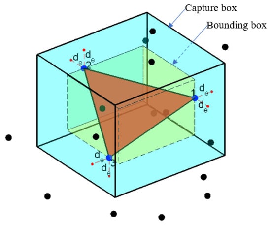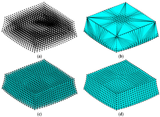 It should be mentioned that care must be given when the circumradius is determined from Equation (8). For some extremely distorted tetrahedrons, the quantity under the root square sign in the expression of may be calculated as a very small minus value or zero due to the round-off error of numerical calculation. For this case, special treatment should be adopted to avoid numerical calculation difficulty and obtain reasonable results. In our implementation, the value is set to a very large positive value, then a large will be calculated from Equation (8) and the corresponding tetrahedron will be dropped. Similarly, the value of calculated with Equation (9) may be minus or zero. If it is zero, then is not calculated from Equation (8), but rather directly set to a very large positive value, so the corresponding tetrahedron will be dropped. If it is minus, then it is set to the absolute value and is still calculated from Equation (8).