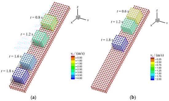 This example considers an initially static block sliding along a slope with an incline angle of 30° due to gravitational force. The block is a cube with side length of 1 m. The slope is a plate with a length of 10 m, width of 1.6 m and thickness of 0.4 m. The block and the slope are both elastic and have the same elastic constants. The material parameters are set as density ρ = 7850 kg/m3, shear modulus G = 76.9 GPa and bulk modulus K = 166.7 GPa. The gravitational acceleration is set to 9.8 m/s2 for z-direction and zero for other directions. Uniform particles with a spacing of 0.2 m are used to discretize the block and the slope. There are 216 particles for the block and 1377 particles for the slope. Figure 4 shows the initial SPH calculation model for the present problem. In this example, the time step is set to 5 10−6 s, and the artificial viscosity constants and are 0.25 and 1.0, respectively. The total simulation time is set to 1.8 s. Since the problem is a small deformation problem, surface reconstruction is only performed at the first time step.