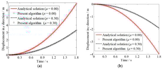 Comparison of the displacements of the block calculated by the analytical method and the present algorithm: (a) Displacement in x-direction; (b) Displacement in z-direction.