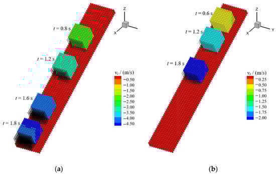 Comparison of the velocities of the block calculated by the present algorithm and the particle-to-particle contact algorithm: (a) Velocity in x-direction; (b) Velocity in z-direction.