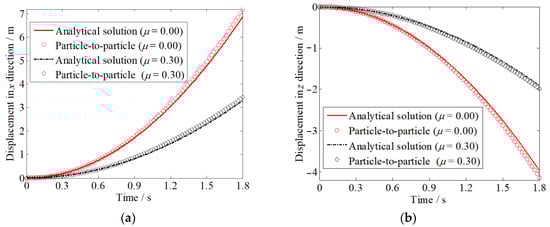 Comparison of the displacements of the block calculated by the analytical method and the particle-to-particle contact algorithm: (a) Displacement in x-direction; (b) Displacement in z-direction.