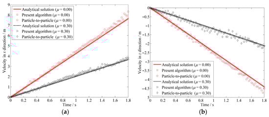 Calculation results of the particle-to-particle contact algorithm: (a) Friction coefficient ; (b) Friction coefficient .