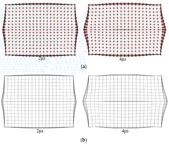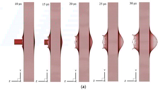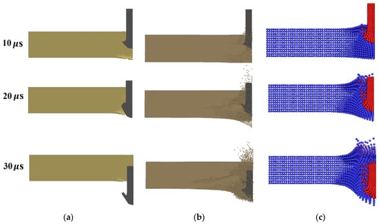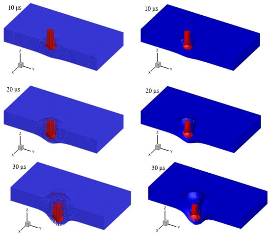 Figure 17 shows the particle distributions and reconstructed surfaces of the ceramic plate and the projectile at different time instants with a section view. The particles of surfaces of the projectile and the ceramic plate are in different colors. Both the ceramic plate and the projectile experience very large deformation. Meanwhile, it can be clearly seen from this figure that the projectile forms a mushroom-shaped head under the resistance of the ceramic plate. Part of failed projectile material becomes fragments separating from the projectile and moves toward the opposite direction of the projectile motion. This indicates the mass loss of the projectile. Note that the mushrooming deformation and erosion of the projectile is also reported in the experimental results [29,30]. Figure 18 shows a comparison between the simulation result of the mushrooming deformation of the projectile at 8 μs and the corresponding experimental result. A good correlation between the simulated and experimental results is observed. Additionally, as seen from this figure, the interface between ceramic material and projectile material is kept clear under such a complex deformation condition. This proves that the present contact algorithm has the strong capability and good stability in dealing with large deformation.