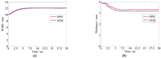 Comparison of width and thickness of the upper block calculated by SPH and FEM: (a) Width; (b) Thickness.