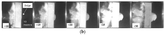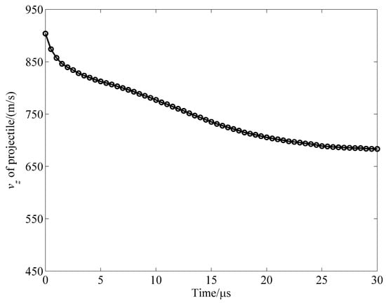Figure 15a shows the impact process simulated by the SPH method with the present contact algorithm. It can be seen that the ceramic material is ejected from the front face. The back-face of the ceramic plate begins to move at about 10 μs, and a slight smooth bulge is formed at this time. The bulge expands as the impact process progresses. The back-face motion of the ceramic plate in the experiment was clearly captured by Sarva et al. [30] with a high-speed camera. The back-face deformation motion reproduced by the simulation agrees well with the experimental observation (see Figure 15b). Figure 16 shows the projectile velocity history. The projectile velocity (absolute value of the velocity in z-direction) decreases monotonically with time and becomes stable at the time of 30 μs. The residual velocity of the projectile predicted by the simulation is about 683 m/s. It is in good agreement with the experimentally measured one (682 m/s) [29].