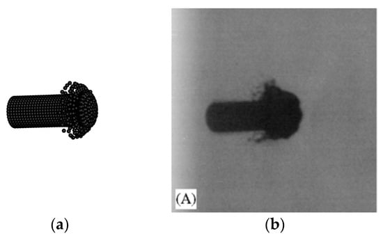 A comparison between the simulated mushrooming deformation of the projectile at 8 μs and the corresponding experimental result: (a) SPH simulation; (b) Experiment result [30].