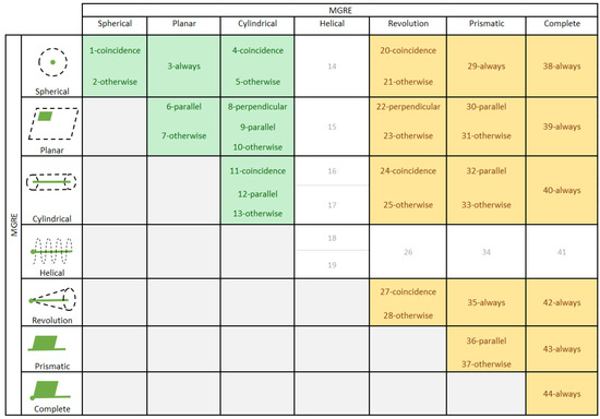 These 44 cases are shown in Figure 2, where a color code is used to differentiate three particular sets of MGRE associations: association between simple MGRE, composed by one RGE (green); associations with at least one complex MGRE, composed by more than one RGE (yellow); and associations where a helical MGRE participates (gray), which are identified separately, because they are not considered in this work (hence, only the remaining 35 cases were modeled). Differentiation between green and yellow associations is important, because cases with complex MGREs are supported by a combination of different constraints defined in the 13 simple cases.