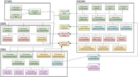 SYSML4TA extends SysML to incorporate the necessary concepts for tolerance analysis, mostly from the assembly domain and TTRS-based modeling. Each of these concepts is defined as a stereotype in the SYSML4TA by extending UML metaclasses and/or specializing SysML stereotypes, as shown in Figure 4. In the figure, stereotypes specializing or extending the same metaclass or SysML stereotype are represented in the same color, and the diagrams that follow it also conform to this color code. The profile is structured with four packages that correspond to different stereotypes, although the stereotypes of different packages are interrelated (dependencies depicted in Figure 3). One subsection is dedicated to presenting each of these packages, including a brief textual description of each stereotype and the depiction of some conceptual diagrams to represent the meta-model abstract syntax. The concepts represented in these diagrams were implemented as stereotypes in the profile (with the same names), and most of the relationships depicted (compositions, dependencies, etc.) are restrictions of the meta-model that were implemented as OCL rules. A complete list of definitions of the stereotypes can be found in Appendix A, and the implementation of some of the OCL expressions is exemplified in Appendix B.