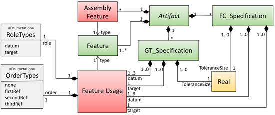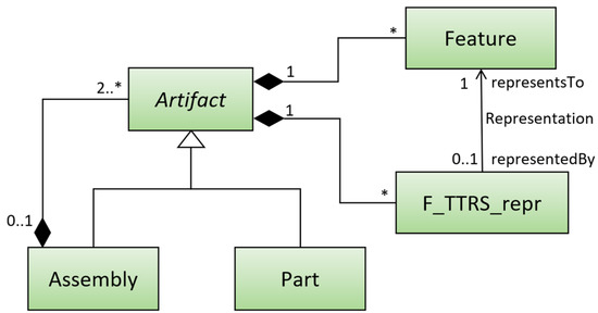 ArtMPP includes stereotypes to support the assembly modeling of the system, describing the assembly structure based on the abstract concept of Artifact and its specializations, Part and Assembly. As represented in Figure 5, an Assembly is composed of at least two artifacts (Parts or Subassemblies). Moreover, any Artifact contains Features (specification of a shape portion of an Artifact) and their F_TTRS_repr, that is, the TTRS-based representation of each Feature in an Artifact. Although these concepts are developed in the next sections, it is important to clarify that the Features are used for the geometric specification of the artifact, while F_TTRS_repr are used for analysis-oriented modeling. To support the strong relationship between properties related with these two views, the stereotype «Representation» is defined as an extension of the Property metaclass. This stereotype includes the “representsTo” Attribute pointing to another property owned by the same parent. Using this mechanism, a property typed by a F_TTRS_repr must be stereotyped by «Representation», defining its “representsTo” Attribute as a property typed by a Feature owned by the same Artifact.