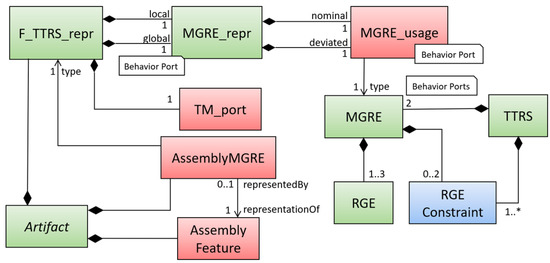 Moreover, to characterize the 35 combinations of related MGREs considered in this work, the TTRS concept was also included as an entity with two Ports typed by MGREs and the mathematical constraints between their RGEs (RGE_constraints). Another important concept is the AssemblyMGRE Port, which is the TTRS-based representation of the previously described AssemblyFeature Port. «AssemblyMGRE» Ports are always typed by «F_TTRS_repr» Blocks, and they support the assembly relationships through connection between TTRS-based representations of different Artifacts. The set of concepts and relationships men tioned up to this point are represented in Figure 7.