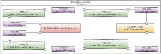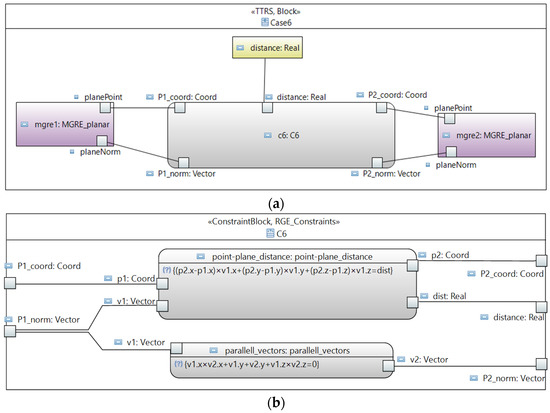 As an example of a «TTRS» Block definition, Figure 10 shows two diagrams related to Case6 block that associates two parallel planar MGREs. Figure 10a shows the Case6 PAR diagram to represent the connections between Parameters of the C6 ConstraintBlock and different properties. Finally, Figure 10b shows the PAR diagram of C6 ConstraintBlock, which is composed of two ConstraintBlocks to mathematically ensure the parallelism and distance between the two planes. Each ConstraintBlock contains a constraint that defines mathematical non-causal equations using the Modelica language.