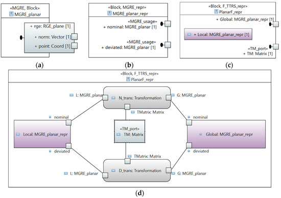 PlanarF_Repr is described as an exemplification of a TTRS-based representation. As shown in the IBD of Figure 11c, a PlanarF_Rep owns two MGRE_planar_repr properties (Local and Global) and one «TM_port» Port of type Matrix. Local and Global properties are related as shown in the PAR diagram (Figure 11d) by means of a coordinate transformation matrix. A MGRE_planar_rep is formed by two properties of type MGRE_Planar (nominal and deviated) as shown at the IBD of Figure 11b. Finally, the IBD at Figure 11a shows that a MGRE_Planar is composed of a behavior Port typed by RGE_Plane Block, which owns two nested ports corresponding to the point and the normal vector.