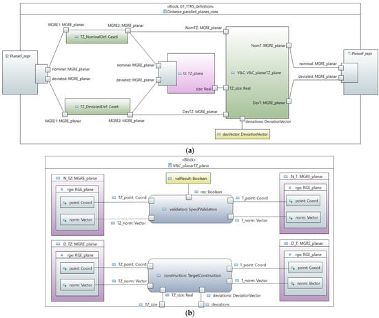 The Distance_parallel_planes_cons is an exemplification of GT construction. This block is composed of different properties, connected as shown in the IBD of Figure 12a. “D” port (typed by PlanarF_repr) is the datum of this GT. “TZ_NominalDef” and “TZ_DeviatedDef” (typed by Case6) contain the constraints to construct the nominal and deviated MGREs of the planar TZ, stored in the “tz” property. “V&C” property (typed by V&C_planarTZ_plane) contains the constraints for the validation of the specification and the construction of the deviated target (“T” Port), applying the deviations defined in the “devVector” property. Figure 12b presents the PAR diagram of the V&C_planarTZ_plane Block, showing the connections between its properties and the Parameters of its ConstraintBlocks (“validation” and “construction”).