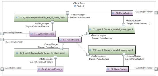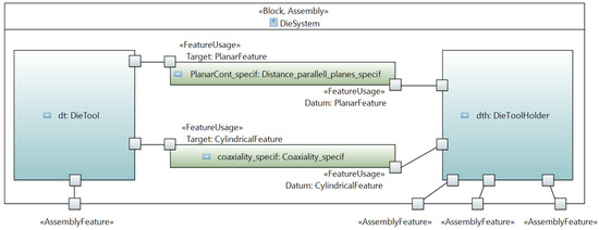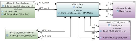 SysML has usually been linked to models with a high abstraction, far from the concretion adopted in typical mechanical engineering models (such as CAD). This is the main reason for the limited adoption of SysML in the field of mechanical engineering [12]. Some works in recent years have explored the integration of SysML models with other domain-specific models, as in [13] or [14], or the mapping of domain-specific models into a common generic system model supported by SysML [15]. Other works are focused on the definition of SysML profiles and, specifically in the domain of mechanical engineering, several proposals such as SysML4Mechatronics [16], SysML4FMArch [17], GERTRUDe [18], or “C&C-M for SysML” [19,20] have been published. However, these works deal with embodiment from the conceptual or functional perspective, but we found no works that used SysML (or SysML profiles) capabilities to model tolerances and support simulation models for geometric variability analysis, an issue that is explored in this work.